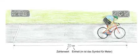 Eine Messung könnte ein Resultat wie das obige liefern: Eine Strecke von s = 20 m. Sie liefert eine physikalische Größe, die aus einem Zahlenwert und einer Einheit besteht. Die Stoppuhr gibt die benötigte Zeit von t ≈ 2 s.