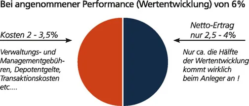 Wir freuen uns z.B. auf eine angenommene Wertentwicklung in Höhe von 6 Prozent. Diese schöne Performance kommt leider ebenfalls nicht bei uns an. 90 % aller Investmentfonds sind aktiv betreut (gemanagt), und haben zwischen 2% und 3,5 % innenliegende Kosten (plus einem eventuellen Ausgabeaufschlag).
