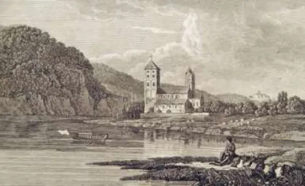 Dem Stolzenfels gegenüber mündet die Lahn. Rechts der Mündung erhebt sich einsam aus Bäumen die alte St. Johanniskirche. Einer ihrer Thürme, der östliche ist kürzlich eingestürzt. Schon von den Schweden zum Theil zerstört, ist die Kirche während der 40jährigen Dauer eines Prozesses über die Verpflichtung des Zehntbesitzes zur Unterhaltung derselben gänzlich zerfallen. Wie oft brachen sich schäumend die Wogen, wie oft donnernd die Eismassen der Lahn, des Rheines, ja der zurückgedrängten Mosel an ihrem Fuße; und noch stehen ihre Grundfesten unerschüttert. Jahrhunderte sah diese Kirche vorüberziehen, fromme Kreuzfahrer an ihren Altären beten, wilde Schweden die Heiligenbilder zertrümmern und durch sonderbaren Wechsel der Zeit, Kalmucken und Baschkiren zu Allah beten! Denn hier ging am 1. Januar 1814 der russische General St. Priest über den Rhein.