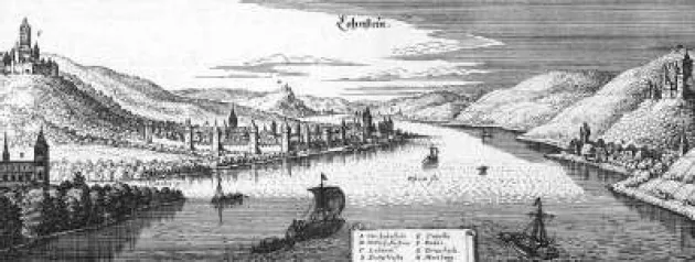Blick auf die St. Johanniskirche mit der Lahnmündung 1819 – Von Christian Georg Schütz, deutscher Maler und Radierer (1758-1823); schuf ab 1804 Illustrationen zur Reiseliteratur.