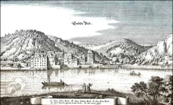 Das Emser Bad im Merian-Kupferstich des 17. Jahrhunderts (Topographia Hassiae 1655)