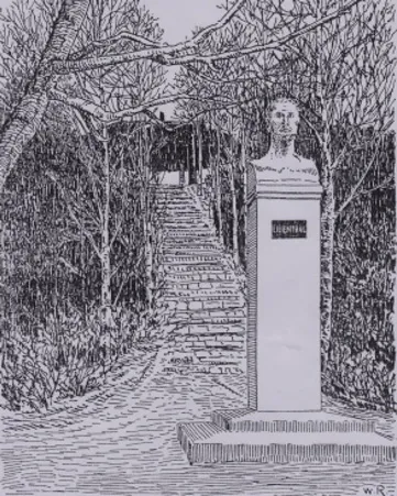 Erstes Lilienthal-Denkmal mit einer Büste von Otto Lilienthal. Quelle: Wilhelm Reichner: Wanderungen durch den Kreis Teltow, Band 2, Berlin 1926, S. 69.