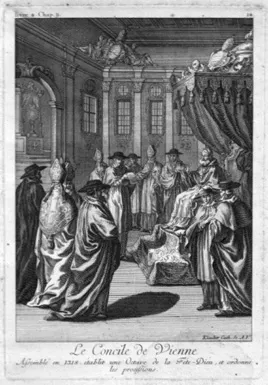 livre 4. Chap. 9 Papst, Kardinäle und Bischöfe haben sich in der Konzilsaula zum Konzil von Vielle (1311/12) versammelt. Im Text zu diesem Stich wird allerdings angegeben, dass erst 1318 die Oktav von Fronleichnam eingeführt und die Fronleichnamsprozession angeordnet wurde.