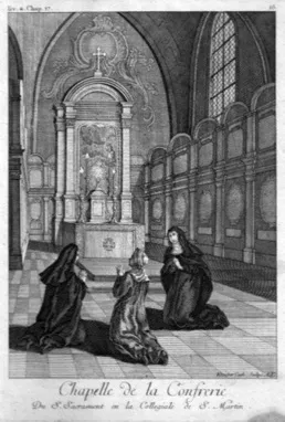 Zwei Nonnen und eine Reklusin knien in einem zentralperspektivisch angelegten Kirchenraum und verehren das Allerheiligste, welches in einer Monstranz auf dem Tabernakel ausgestellt ...
