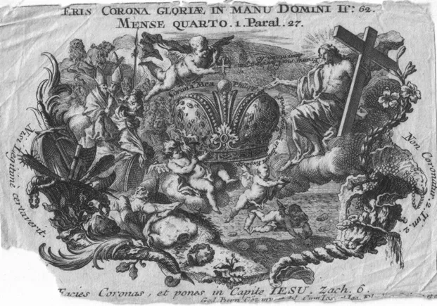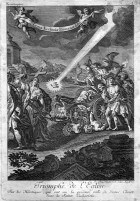 Frontispice. Zwei Putten halten das Spruchband mit dem Thema der Darstellung: Legia Ecclesiae Romanae filia. Die drei Tugenden Glaube (Kreuz) Hoffnung (Anker) und Liebe ziehen eine Kutsche. Auf dieser steht vorn ein Pelikan, welcher seine Jungen aus seiner Brust ernährt, Zeichen für Christus. In ihr sitzt die personifizierte römisch-katholische Kirche. Sie hält eine Monstranz vor sich und ein Engel bekrönt sie mit der Tiara, der Papstkrone. Ketzer geraten unter ihre Räder oder werden gefesselt durch eine erleuchtete Person mit Fackel wie Sklaven mitgeführt. Aus dem Himmel bricht ein Lichtstrahl, in welchem die Hl.-Geist-Taube herabfliegt. Auf einem Berg sieht man symbolisch den Petersdom. Im Vordergrund erkennt man verdunkelt antike Ruinen.