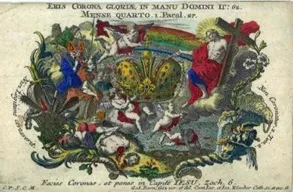 Die Krone erhält von einem Engel ein Kreuzchen aufgesetzt. Rechts sieht man den hl. Lukas (Stier), heilige Bischöfe und Martyrer. Die Details werden durch Schriftzüge erläutert.