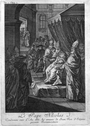 liv. 1. Chap. 1 Papst Nikolaus I. (858 - 867) verurteilt die Lehre über die Eucharistie von Scot d’Eriogene. Die Personen sind hintereinander und leicht in die Höhe gestaffelt: Im Vordergrund, verschattet, stehen vielleicht die Verteidiger der Lehre von Scott. Dann folgt der Papst auf seinem Thron, umgeben von zwei Bischöfen und einem Mönch: Nach rückwärts folgen weitere Gruppen von Geistlichen. Im Hintergrund betreten zwei Personen die päpstliche Audienzhalle.