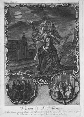 livre 1. Chap. 16 Das Bild zeigt drei Szenen aus dem Leben der hl. Juliane von Lüttich. Jede hat einen Rocaillen-Rahmen. Danach könnte der Stich um 1745 entstanden sein. Der Entwerfer hat zwar einige Schwierigkeiten in der Perspektive (vgl. Kirche im Hintergrund), aber in den Personendarstellungen wirkt er recht souverän. Die Anregung zur Schaffung des Fronleichnamsfestes geht auf eine Vision der hl. Juliana 1209 zurück: Sie sah den Mond, der an einer Stelle verdunkelt war. Christus erklärte ihr, dass der Mond das Kirchenjahr bedeutet und der dunkle Fleck das Fehlen eines Festes des Altarsakraments meint. In allen drei Szenen ist hier dieser Mond zu sehen.
