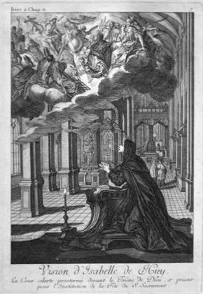 livre 2.Chap.11 Hier handelt es sich wohl um Isabella von Huy (?). Sie war eine Mitstreiterin von Juliane von Lüttich. Sie kniet an einer Bank, welche die Ornamentik der Mitte des 18. Jahrhunderts zeigt, und blickt visionär in den Heiligenhimmel mit der Dreifaltigkeit und Heiligen (Maria, Joh.Bap., Laurentius, Petrus, Paulus, Barbara, Katharina) Der Kirchenraum hat noch einen Lettner. Der Altar im Hintergrund ist hochbarock.
