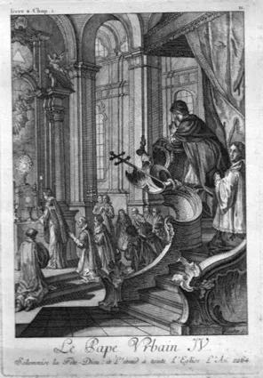livre 4. Chap. 1 Papst Urban IV. (1261 – 1264) führte 1264 das Fronleichnamsfest für die Kirche ein. Ein Priester liest im Hintergrund die hl. Messe an einem Barockaltar mit gesprengtem Giebel. Der Kirchenraum zeigt sich stellenweise rokokohaft (vgl. die Fensterformen). Besonders deutlich erkennt man diese Kunstzeit am Aufgang zu einem Oratorium, wo der Papst kniet. Die Muscheln lassen diesen Stich in die Mitte des 18. Jahrhunderts datieren.
