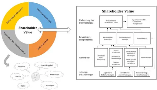 Shareholder-Orientierung ist wesentlich breiter zu verstehen, als es im klassischen Shareholder-Value-Ansatz zum Ausdruck kommt. Neben finanziellen Zielen (wie Vermögenssicherung, Vermögensmehrung, Dividendenorientierung und Vermögensdiversifikation) stehen vor allem persönliche Ziele wie das Streben nach Sicherheit, persönliche Unabhängigkeit, das Regeln der Unternehmensnachfolge, die familiäre Vermögensaufteilung, persönliche Selbstverwirklichung, Sozialprestige, Verantwortung für das Umfeld des Unternehmers, philanthropische Motive, ethische Grundhaltungen, Risikoneigung etc. im Mittelpunkt der Betrachtung. Auch die Lebenssituation des Unternehmers (Beziehungskrise, Krankheit, mangelnde Freizeit etc.) verändert mitunter den Blickwinkel und die Prioritäten.