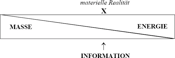 Dies lässt sich in der folgenden Darstellung gut nachvollziehen. Die Information kann wie ein Zünglein an der Waage verstanden werden. Kommt sie mehr auf der rechten Seite – der Energie – zum Tragen, wird das Ergebnis feinstofflicher sein, also weniger Masse repräsentieren. Wird sie weiter links wirksam, wird mehr Masse zu erwarten sein. Trotzdem steckt in jedem Anteil immer Masse und Energie. Dort, wo Masse auftaucht, ist immer auch Energie und Information (die formprägende geistige Idee) vorhanden.