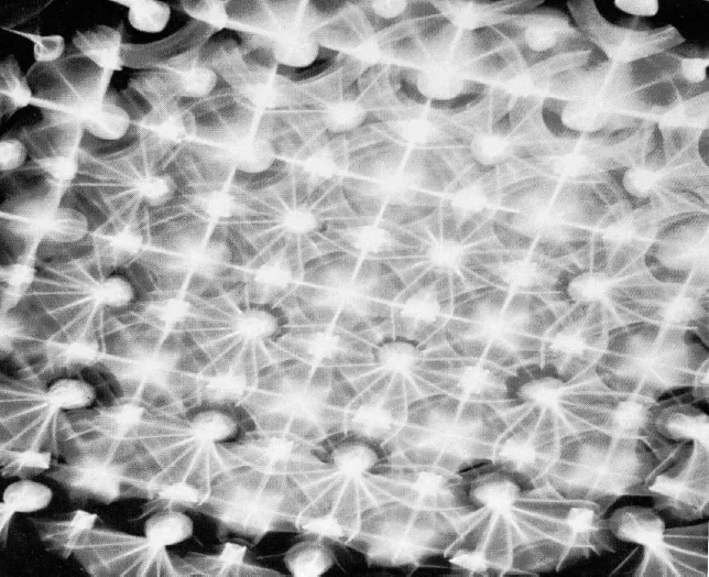 In der folgenden Abbildung zeigt sich die implizite Ordnung einer Terpentilölschicht, und man erkennt sehr gut die exakte Geometrie, die einer Vierheit gehorcht.