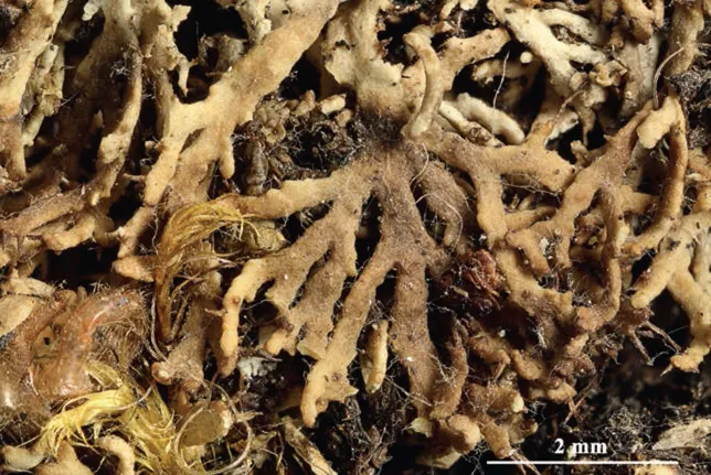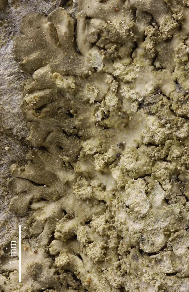 Endlappen 0,3-0,45 mm breit, sehr dicht anliegend, unbereift. Sorale anfänglich laminal, körnig isidiös, erst oval dann zusammenfließend. Unterrinde prosoplektenchymatisch, im Zentrum schwarz zum Rand hin heller; Rhizinen fehlen oder nur ganz spärlich ausgebildet. Sehr ähnlich manche Phaeophyscia Arten, die jedoch besser entwickelte Rhizinen haben. Corticol. Europa, Afrika, Amerika, Australien. Chemie: Rinde und Mark K-, C-, KC-, P-, TLC: gelegentlich Spuren von Skyrin.
