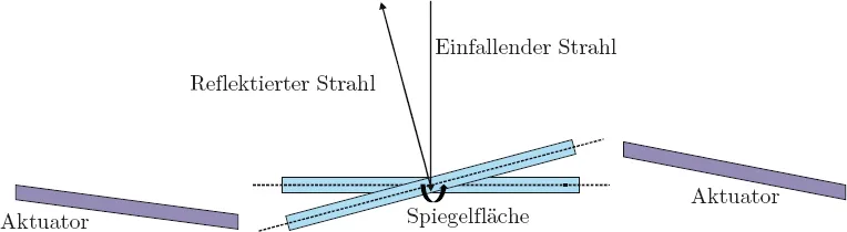 Abbildung 1.1: Querschnitt eines tordierenden Mikrospiegels, der von zwei umliegenden Aktuatoren angetrieben wird, sowie die einfallenden und reflektierenden Lichtstrahlen.