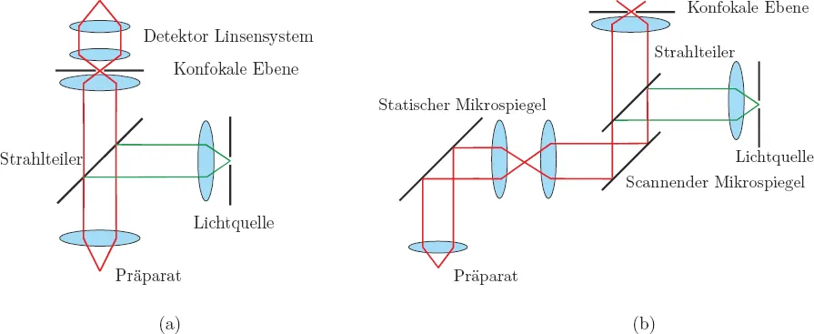 Abbildung 1.2: Schematische Darstellung des Aufbaus eines konfokalen Mikroskops: (a) ohne scannenden Mikrospiegel; (b) mit scannendem Mikrospiegel.