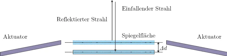 Abbildung 1.3: Querschnitt eines translatorischen Mikrospiegels (Δd: Bewegungsamplitude), der von zwei umliegenden Aktuatoren angetrieben wird, sowie die einfallenden und reflektierenden Lichtstrahlen.