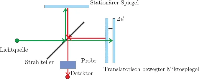 Abbildung 1.4 zeigt den Aufbau und das Funktionsprinzip eines Fourier-Transformations-Infrarotspektrometers (FTIR). Von der Lichtquelle ausgehendes Licht wird von einem Strahlteiler sowohl auf einen stationären Spiegel als auch auf den beweglichen Mikrospiegel gelenkt. Die reflektierten Lichtstrahlen werden am Strahlteiler wiederum zu einem Strahl vereinigt. Aufgrund des Wellencharakters des Lichts ist der resultierende Strahl das Ergebnis konstruktiver oder destruktiver Interferenz der beiden Teilstrahlen. Durch die Verschiebung des beweglichen Mikrospiegels wird die Phasenlage der beiden Teilstrahlen kontinuierlich verändert, welches sich in einer Intensitätsmodulation des vereinigten Lichtstrahls äußert. Der so modulierte Lichtstrahl wird durch die zu beobachtende Probe, z. B. ein gemischtes Gas, geführt, wobei das Licht charakteristischer Wellenlängen von der Probe absorbiert wird. Das verbliebene Licht (das Interferogramm) enthält unterschiedliche Frequenzen bzw. Wellenlängen und wird vom Detektor registriert. Das entsprechende Spektrum des Interferogramms wird mittels Fourier Transformation berechnet, wovon auf die Eigenschaften der Probe geschlossen werden kann. Für die Anwendung in einem FTIR sind die Bewegungsamplitude des Spiegels und die Parallelität der Spiegelfläche entscheidend, weil diese zusammen das spektrale Auflösungsvermögen bestimmen.