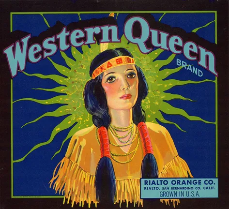 - Western Queen Brand, Orangen, Rialto Orange Co., Rialto, Western Litho. Co. Los Angeles, Mai 1953. Das Fenster in der Mitte des Stirnbandes der schönen Indianerin war ursprünglich ein Hakenkreuz, dessen offene Seiten nach der Machtergreifung der Nazis geschlossen wurden. Das Plakat Western Queen wurde von Archie J. Vazquez geschaffen, der 1918 zur Western Lithograph Company nach Los Angeles ging und dort bis 1956 als Direktor der Entwurfsabteilung wirkte. Zahlreiche Kistenplakate wurden von ihm bzw. unter seiner Verantwortung geschaffen, z. B. auch La Reina (Rahmen 07, Nr. 5).