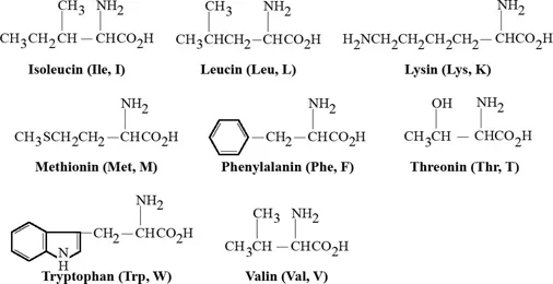 Isoleucin, Leucin, Lysin, Methionin, Phenylalanin, Threonin, Tryptophan, Valin