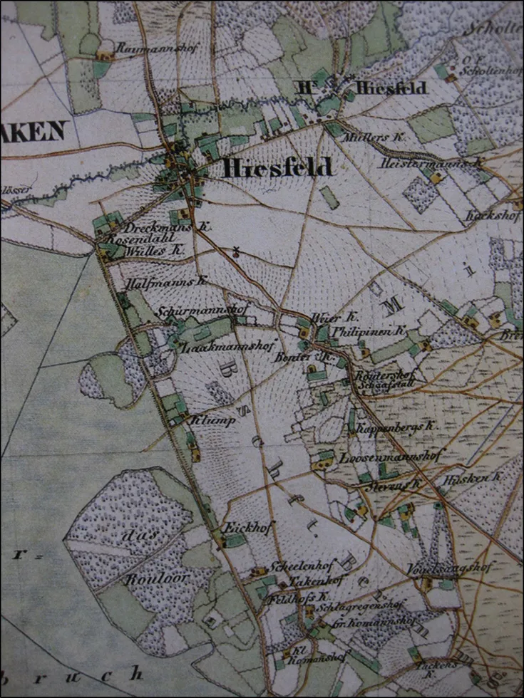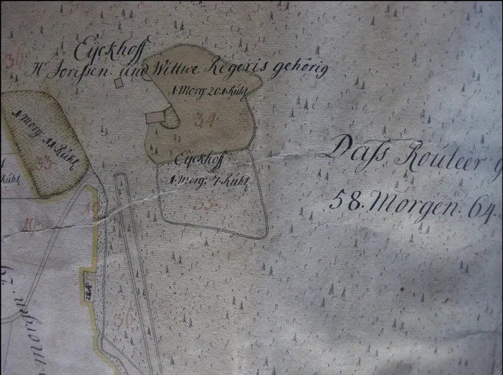 Diese von Enbers erstellte Katasterkarte aus dem Jahre 1736 zeigt die Lage des unmittelbar an das Rouleer angrenzenden Eickhof-Gehöftes