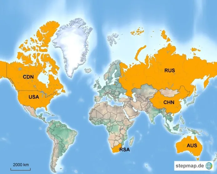 - Die großen Förderländer: USA, Kanada, Südafrika, UdSSR (Russland), Australien und China