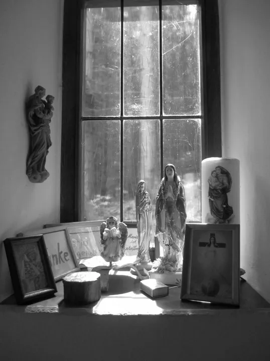 Wir wandern ein Stück aufwärts. Oberhalb des Dorfes im Wald eine Kapelle, in der durch ein rundes Deckenfenster die Sonnenstrahlen auf die Muttergottes treffen. Im hellblauen Gewand steht sie mit dem Jesuskind auf einem Gesteinsbrocken. Umrahmt von bunten Plastikblumen. Die Urmutter der religiösen Menschen. Die Gewandfarbe teilt sie mit Isis. Die ihr entgegen gebrachte Verehrung mit den Fruchtbarkeitsgöttinnen. Sie ist älter als Jesus, Tausende von Jahren.