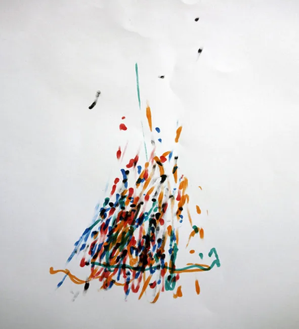 An example is shown in the following painting. It was produced by my grandson Paolo at the Museum Tinguely, Basel, in cooperation with a Méta-Matic Drawing Machine of Jean Tinguely during the exhibition ”tinguely@tinguely” on March 30, 2013.