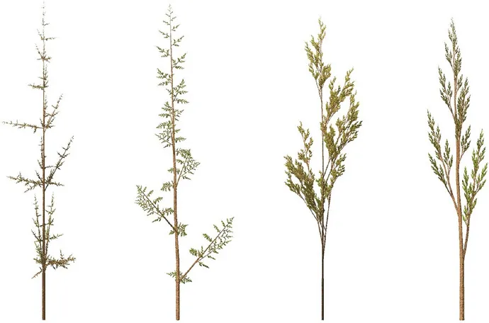 Artificial plants generated using an L-system in 3D. Image by Solkoll [Wikimedia Commons, Public Domain, Gemeinfrei]