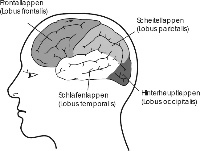 Der Cortex wird in vier Bereiche oder „Lappen“ eingeteilt. Man unterscheidet Stirnlappen, Scheitellappen, Schläfenlappen und Hinterhauptslappen (siehe Abbildung 2.2). Die Großhirnrinde wird in anatomische Felder eingeteilt. Die sogenannten sensorischen Felder haben mit der Verarbeitung von Informationen des Sehens (im Hinterhauptslappen), des Hörens (am oberen vorderen Rand des Schläfenlappens), der Körperempfindung und des Gleichgewichts (am vorderen Rand des Schläfenlappens)zu tun. Der insuläre Cortex liegt tief eingesenkt zwischen Stirn-, Schläfen- und Scheitellappen. Dort werden das Körpergefühl, die affektive Schmerzempfindung, die Eingeweidewahrnehmung, und die Geschmacksempfindungen verarbeitet. Riechinformationen werden in der Riechrinde verarbeitet, die in den limbischen Rindenarealen liegt (vgl. Roth 2007, S. 39-41).