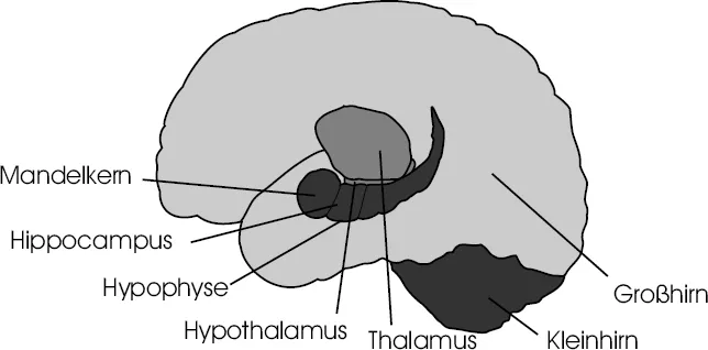 Deshalb ist es zuerst wichtig, sich über den Bau und die Funktion kundig zu machen (vgl Roth 2007, S. 33). Das Gehirn liegt im Schädel und ist der wichtigste Teil des Zentralnervensystems. Es ist in das Gehirnwasser eingebettet und gegen Druck und Stoß geschützt. Der älteste Teil des Gehirns ist das Stammhirn, das beim Menschen von den anderen Gehirnteilen fast verdeckt ist (siehe Abbildung 2.1). Bei Tieren macht es heute noch fast die gesamte Hirnmasse aus (vgl. Vester 2007, S. 15).