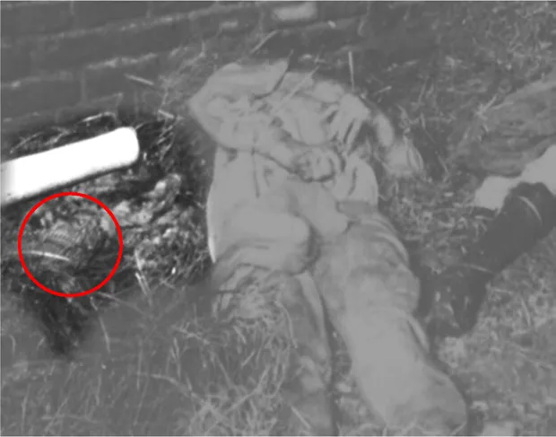- Es werden nur fünf Tatortfotos aufgenommen, deren Aussagekraft zudem durch (a) die nachträgliche Rekonstruktion der Auffindesituation sowie (b) die aus ethischen Gründen vorgenommene Manipulation der Leichen beeinträchtigt wird71. Unter anderem lässt sich die Lage der Leiche von Cäzilia Gabriel anhand des Bildmaterials nicht auf Anhieb bestimmen, sondern kann unter Hinzuziehung der einschlägigen Augenscheinprotokolle lediglich vermutet werden (Abbildung 9)72.