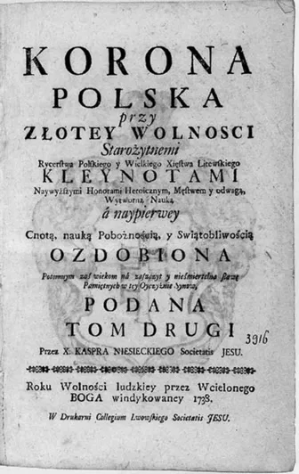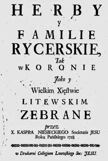 Kasper Niesiecki: Originalausgabe Lwów 1728 – Herby y Familie Rycerskie Tak w Koronie Jako y Wielkim Xięstwie Litewskim [Wappen und Riterlichen Familien wie in der Krone so auch im Großfürstentum Litauen]. Das Werk sollte in der für beide Reichsteile neutralen Sprache - in Latein – erscheinen. Durch die Pression der das Werk finanzierenden Marianna PotockaTarłowa wurde es in polnischer Sprache publiziert. Ergebnis der polnischen „Verstaatlichung“, die aus dem Originaltitel entstanden ist (siehe vorstehend auf dem zweiten Titelblatt) Kasper Niesiecki: Originalausgabe [Lwów] 1738 - Korona Polska … [Die Krone Polens …].