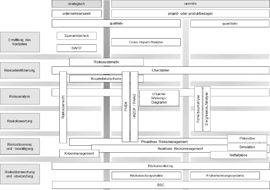 Es gibt mehrere Methoden, welche in der präventiven Analytik zum Einsatz kommen können. In der folgenden Grafik sind die wichtigsten und am häufigsten verwendeten Risikoanalysen abgebildet. Die FMEA, mit welcher wir uns beschäftigen, liegt im operativen Bereich und deckt folgende Risikobereiche ab: