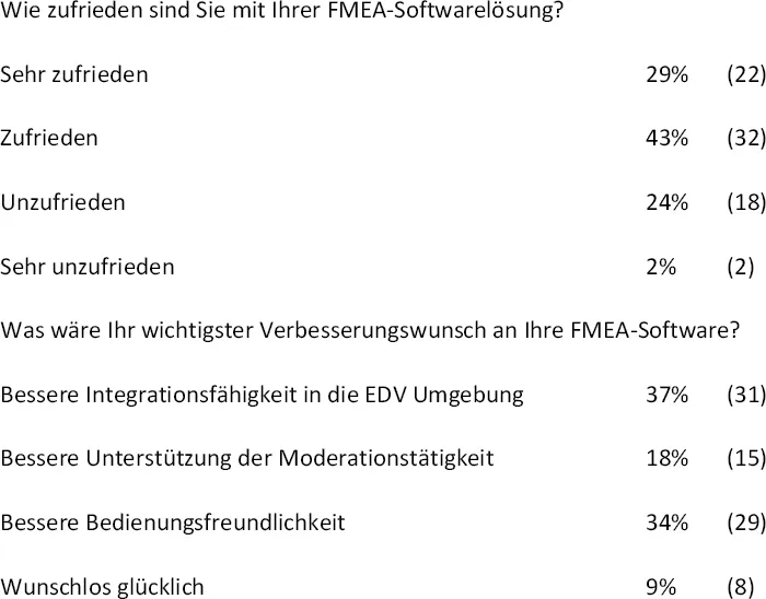 Die Umfrage zeigt, dass ca. ein Viertel der Befragten mit Ihrer aktuellen FMEA-Softwarelösung nicht zufrieden ist. Darüber hinaus werden vor allem die Integrationsfähigkeit in die EDV-Umgebung und die Bedienungsfreundlichkeit bemängelt.