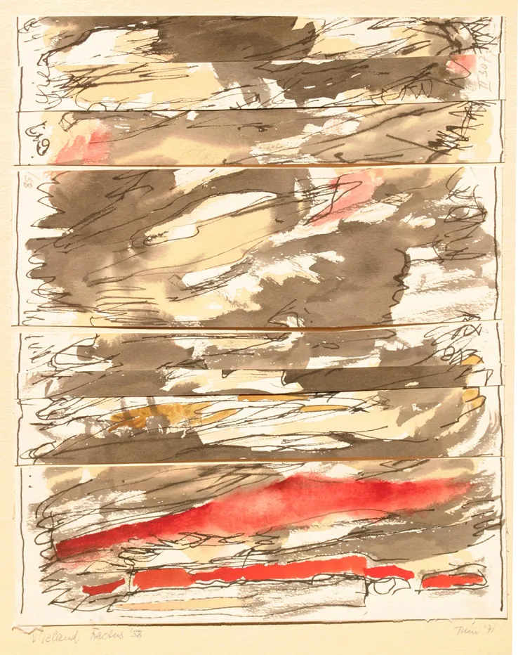 Das Meer wirft aus. Der Strand ist bedeckt mit pflanzlichen, tierischen Resten, Tang, Muscheln, Schnecken. Der menschliche Fuß zermahlt das Kleinste noch einmal, was die Woge schon zermahlen hat. Es knackt mit jedem Schritt unter den Sohlen. Aber es schreitet sich gut auf der plattesten aller natürlichen Ebenen, die dort entsteht, wo der Strand noch feucht ist und die verebbende Welle im Strom und Rückstrom eben den Weg bereitete. Und was das Wasser freispülte, hüllt der fließende Sand mit feinen Schichten und Hüllen ein. Für die Sonne – im Gegenlicht – ein gleißender Spiegel. Fern am Horizont die Masten und Schornsteine von Schiffen, Rauchfahnen. Möwen, Seeschwalben, Austernfischer, im Fluge schreiend mit dem Winde – weißes Geflügel über der lärmenden Brandung, Gischtflocken, Spritzer, dumpfer Lärm. Hier scheint der Gedanke wichtiger als das Bild. Der Stern des Tages. Das innere Licht.