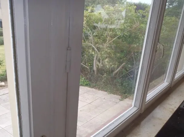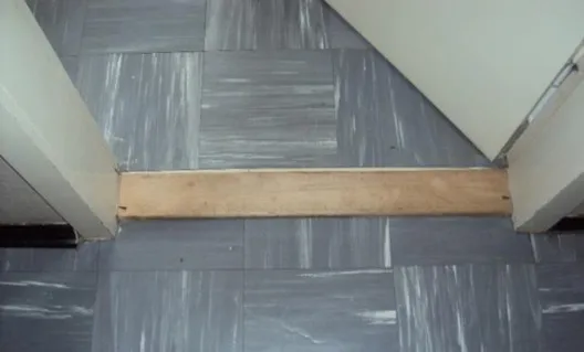 Eine technisch intakte Tür, aber nicht mehr dem Zeitgeist entsprechend, mit Schwelle (Stolperkante)