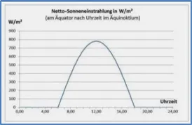 Anmerkung: Der Wert von 780 W/m2 leitet sich aus WEBER (2016) her, wo die temperaturwirksame Sonneneinstrahlung als ein Zweischichtfall für Atmosphäre und Erdoberfläche betrachtet wird. Der hier dargestellte äquinoktiale Kurvenverlauf am Äquator für das Zeitfenster zwischen 6:00 und 18:00 Uhr entspricht übrigens auch dem Verlauf der Sonneneinstrahlung zwischen den beiden Polen von -90° bis +90° geographischer Breite mit dem Äquator auf 12:00 Uhr im mittäglichen solaren Zenit.
