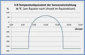 Oder anders ausgedrückt: Nach der vom Stefan-Boltzmann-Gesetz eindeutig vorgegebenen Gesetzmäßigkeit zwischen der ganz konkreten Temperatur eines Schwarzen Strahlers und seiner dadurch eindeutig definierten Strahlungsleistung in einem thermischen Gleichgewicht existiert für eine wie immer ermittelte durchschnittliche Energiemenge kein entsprechender S-B-Durchschnittswert für die Temperatur. Die nachfolgenden Abbildungen 1 und 2 einer S-B-konformen Berechnung für die Tagseite der Erde verdeutlichen die zitierte Aussage von Gerlich (1995):