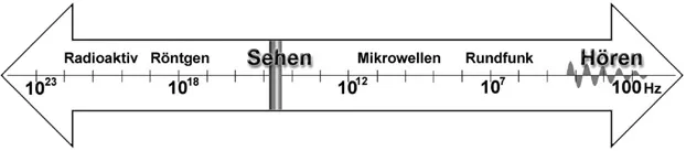 Der Frequenzbereich in dem wir sehen ist nur ein minimaler Ausschnitt aus dem vermutlich unendlichen Frequenzspektrum. Wie auch der Bereich in dem wir hören nur einen Ausschnitt für uns auf diese Weise (hören) darstellt. Den vermutlich unendlich großen Rest können wir einfach nicht wahrnehmen, weil wir kein Sensorium dafür haben und auch moderne Messgeräte können das nur ein wenig erweitern.