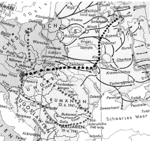 Schwarze Punkt–Linie: Russland-Feldzug von Wien laut Tagebuch.