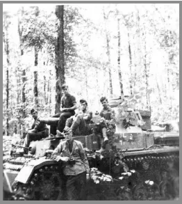 Hier mitten in einem Hochwald biwakieren wir, tarnen unsere Fahrzeuge und legen uns nach dem anstrengenden Nachtmarsch (100 km) sofort zur Ruhe. Im Laufe des Tages wird aufgetankt und Munition gegürtet und wieder geschlafen. Gegen Abend machen wir uns wieder abmarschfertig.