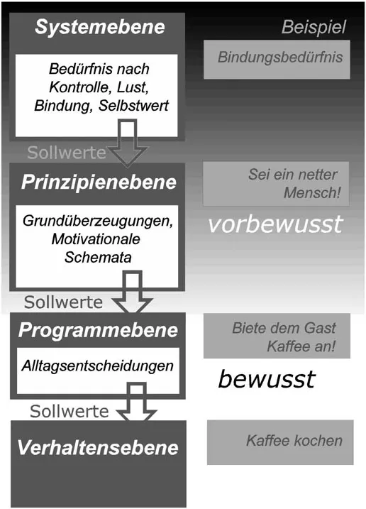 Ganz oben ist die Systemebene, von der die Prinzipienebene als zweitoberste bestimmt sei (Abbildung 1).21 Die Systemebene sei die Ebene der seelischen Grundbedürfnisse, nach Kontrolle, Lust, Bindung und Selbstwerterhöhung (Abbildung 2).22 Die Prinzipienebene enthalte die individuellen Grundsätze nach denen der Einzelne versuche, die Bedürfniserfüllung optimal zu gewährleisten. Diese Grundsätze werden motivationale Schemata genannt: „Die motivationalen Schemata sind die Mittel, die das Individuum im Laufe seines Lebens entwickelt, um seine Grundbedürfnisse zu befriedigen und sie vor Verletzung zu schützen.“23 Miteinander würden die motivationalen Schema ein „zusammenfassendes“ Selbstschema bilden, „das die psychische Aktivität des Individuums massgeblich bestimmt.“24 Physiologisch betrachtet bestünden die motivationalen Schemata und ihre Derivate in „neuronalen Erregungsbereitschaften […]. Sie sind in cell assemblies oder neuronalen Gruppen organisiert.“25 Aus der Prinzipienebene würden sich die Sollwerte der Programmebene ableiten, auf der unser Alltagsbewusstsein angesiedelt sei.26 Aus welchen Grundüberzeugungen die Alltagsentscheidungen jeweils resultieren, ist uns normalerweise nicht bewusst, weil es sich um automatisierte Vorgänge handelt. Neuropsychologisch gesehen ist Automatisierung Bahnung stabiler neuronaler Verschaltungen.