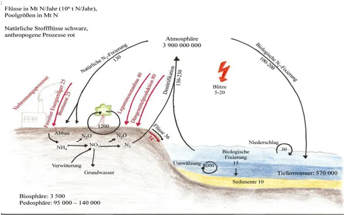 Stickstoff ist eines der unverzichtbaren Elemente für lebende Organismen. Den größten irdischen Stickstoffpool stellt die Atmosphäre mit nahezu 78% der Lufthülle dar. Diese etwa 3,9 Mrd. Mt N (3,9 * 1015 t Stickstoff) liegen zum größten Teil in Form von N2 vor. (siehe Abb. 1). (vgl. Fritsche (2009): 18). Die Stickstoffmenge, die in den Landpflanzen mit 3 500 Mt N, und der abgestorbenen Biomasse, mit 95 000 bis 140 000 Mt N, gespeichert ist, ist dagegen relativ gering. (vgl. Fabian (2002): 98). Pflanzen benötigen Stickstoff jedoch nicht in inerter, sondern in reaktiver Form, nämlich als Nitrat- (NO3-) oder Ammoniumionen (NH4+), welche häufig den limitierenden Faktor des Pflanzenwachstums darstellen. (vgl. Fritsche (2009): 18). Durch die Denitrifikation, die Reduktion von NO3-, und die Nitrifikation, die Oxidation von NH4+, kommt es zu ständigen Stickstoffverlusten. Desweiteren gelangt ein gewisser Anteil dieser Ionen in Gewässer. Durch die Stickstofffixierung aus der Atmosphäre müssen diese Verluste kompensiert werden. (vgl. Fabian (2002): 99).