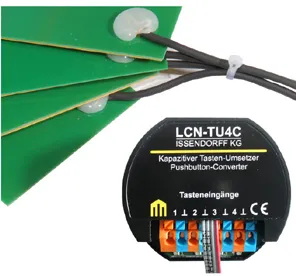 Eine besondere Art des Tasters ist der LCN-TU4C: Er ist unsichtbar! Genauer gesagt, lässt er sich unter Holz, Kunststoff und Glas bis 2,5 Zentimeter Dicke (Fliesen und Granitstein immerhin noch bis 2 Zentimeter Dicke) verbauen. Der TU4C besteht aus vier selbstklebenden Sensorflächen, die hinter elektrisch nicht leitfähigen Materialien angebracht werden. So lassen sich überall dort raffinierte Lösungen realisieren, wo man keine sichtbaren Schalter wünscht, zum Beispiel in einem exklusiven Bad – oder bei mir am gefliesten Boden meines Gartenhauses.