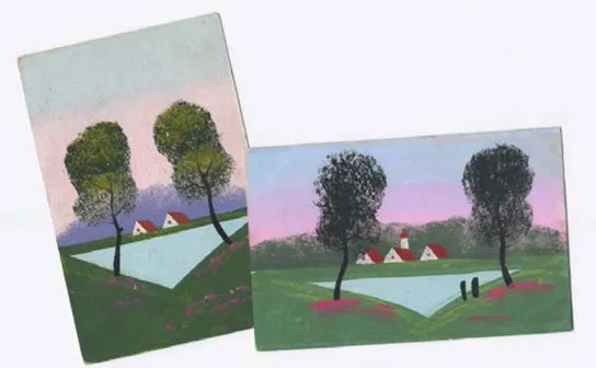 Die vermutete Massenproduktion dieser Kartenvariation wird bestätigt durch die Beschaffenheit der Malerei auf den Karten als Indiz. Sie unterscheidet sich deutlich von derjenigen der Jahre 1912 bis 1914/15, indem das Serielle, Gröbere, Flächenmäßige klar hervor tritt und die zuvor vorhandenen Feinheiten der zeichnerischen Ausgestaltung vollständig fehlen. Zudem hat sich das Motiv-Repertoire auf dieser Vielzahl von Karten drastisch reduziert. Die Malerei folgt ganz wenigen, in Bezug auf Schlichtheit kaum noch steigerungsfähigen Schemata, und feiner ausgeführte Gegenstände oder Lebewesen im Vordergrund tauchen grundsätzlich nicht mehr auf.