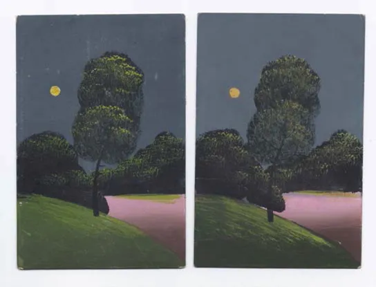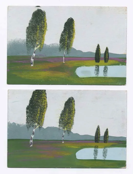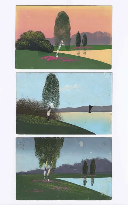 Die – wiederum: immer gleichen – Bäume (zumeist Birken, manchmal Zypressen oder undefinierbare Laubbäume) sind als letzter Arbeitsgang hinzu gefügt, wobei mit dem Pinsel getupft wurde oder kleine Farbschwämme zum Einsatz kamen. Die Beschaffenheit dieser gleichförmig-reduzierten Karten aus den Jahren 1920 bis 1924 legt nahe, dass sie von anderen Personen als zuvor, gegebenenfalls von angelernten Arbeitskräften gefertigt worden sind, vielleicht von Kindern, eher noch von Hilfskräften, denen jeder ästhetische oder handwerkliche Anspruch fremd war. Nicht ausgeschlossen scheint jedoch grundsätzlich auch, dass dasselbe Personal nunmehr unter vehement erhöhtem Zeitdruck tätig sein musste.