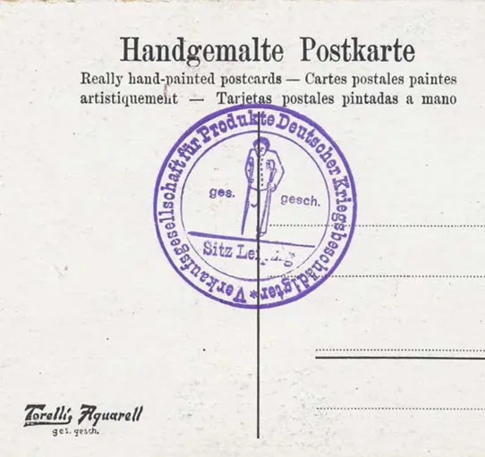 Sehr interessant im Hinblick auf diesen Aspekt der Qualität und somit der „eigentlichen“ Produzenten, vor allem ihrer handwerklich-künstlerischen Fähigkeiten, ist eine bislang singuläre Karte von Torelli, die auf der ansonsten unbeschrifteten Rückseite einen recht voluminösen Rundstempel trägt. Dessen Umschrift lautet: Verkaufsgesellschaft für Produkte Deutscher Kriegsbeschädigter – Sitz Leipzig – ges. gesch.. Im Zentrum des Stempels findet sich die kleine Umrisszeichnung eines beinamputierten Kriegsversehrten auf Krücken.