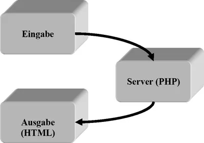 Grundsätzlich funktioniert es so, dass eine Eingabe (z.B. über ein HTML-Formular) von einem Anwender an einen Server geschickt wird, auf dem sich PHP und MySQL befinden. Dabei wird beispielsweise eine Seite, die sich auf dem Server befindet, durch das Abschicken eines HTML-Formulars aufgerufen. Auf dem Server wird dann das PHP-Programm, welches in diese Seite eingebunden ist, abgearbeitet. Hier können dann auch gesendete Daten beispielsweise in einer MySQL-Datenbank gespeichert werden. Die Seite, die der Anwender aber in seinem Browser sieht, enthält nur HTML-Anweisungen. Somit sehen Anwenderinnen und Anwender auch nicht die dahinterstehenden Programmen.