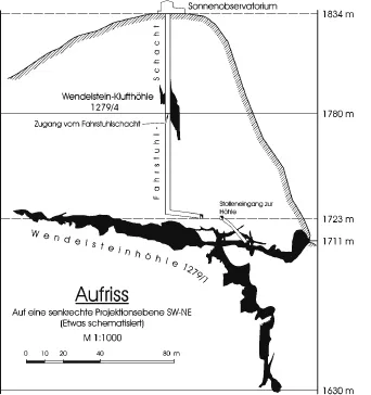 Die Attraktion freilich, um die es hier geht, ist kaum zwei Minuten von der Bergstation der Bahnen entfernt; die Wendelsteinhöhle (Kat.-Nr. 1279/1), Höhe über NN 1.711 m, mit einer Gesamtlänge von 523 Metern und einer Höhendifferenz von insgesamt 97 Metern (+21m/-82m)! Gibt es überhaupt eine Höhle, die im Gipfelaufbau eines Berges liegt und noch bequemer erreichbar ist?